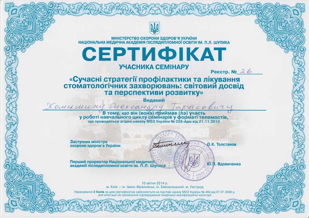 Сучасні стратегії профілактики та лікування стоматологічних захворювань (сертифікат) Оприлюднено 10 Листопада, 2019 автором Олександр Хомишин Відвідав семінар 2014 року в м.Київ
