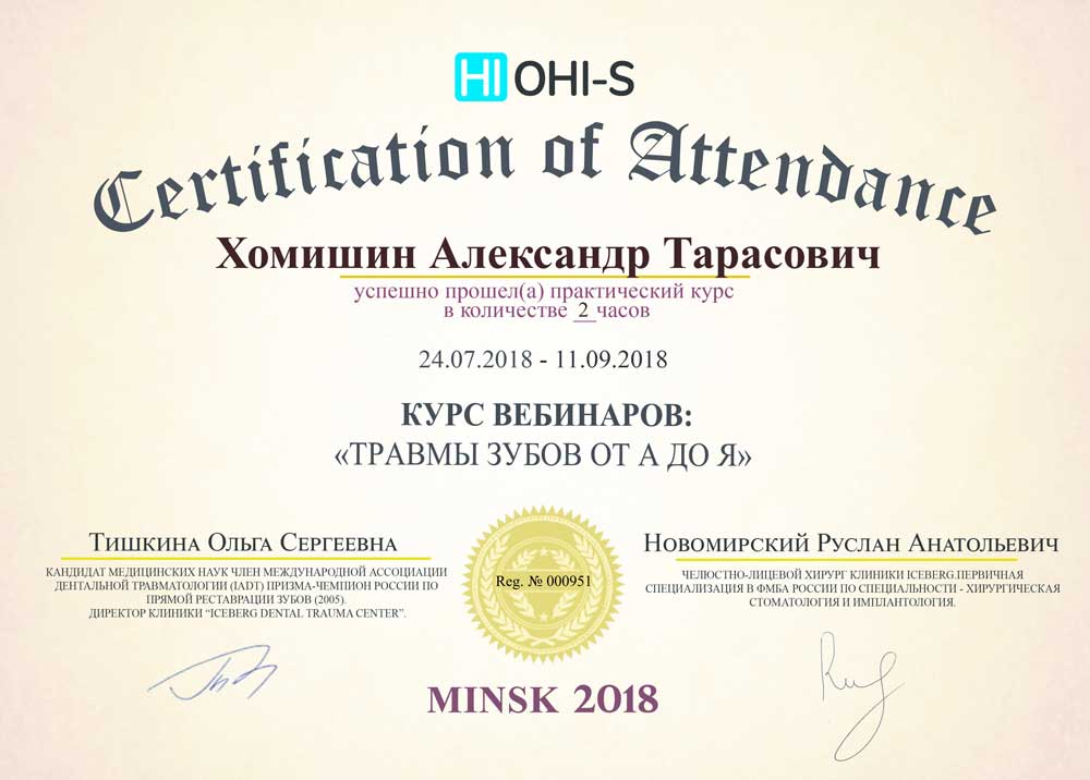 Травмы зубов от А до Я (сертифікат) Оприлюднено 10 Листопада, 2019 автором Олександр Хомишин Прослухав курс вебінарів 2018 року