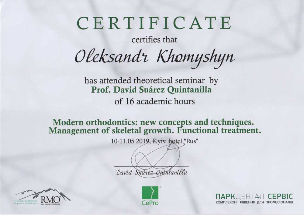 Modern orthodontics: new concepts and techniques. Management of skeletal growth. Functional treatment (сертифікат) Оприлюднено 10 Листопада, 2019 автором Олександр Хомишин Відвідав теоретичний семінар від професора David Suarez Quintanilla 2019 року в м.Київ